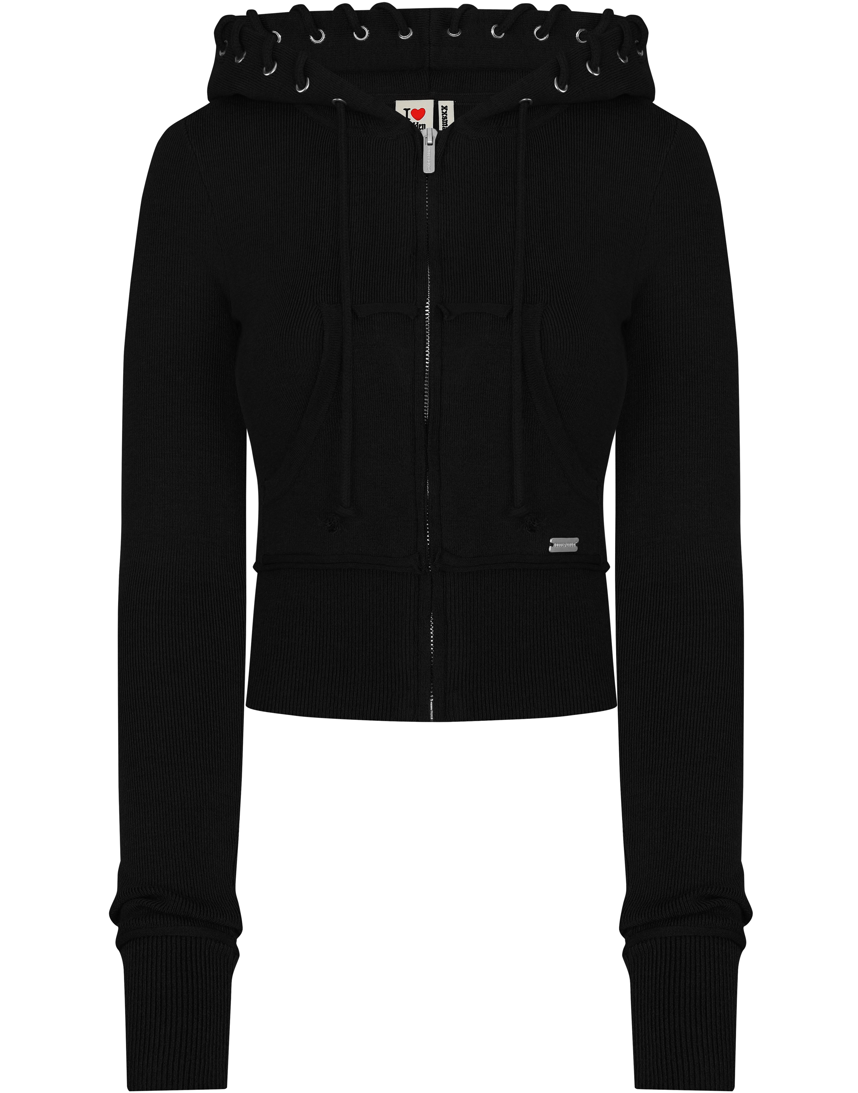 Original design by HIDDEN CULT®. This set is crafted from a medium-weight, ultra-soft, and highly stretchy knit fabric made from our custom "Jet Black" black yarn. It features subtle branding, including brushed matte silver hardware and a hand-sewn, logo-engraved metal badge on both the zip hoodie pocket and pants. The zip hoodie is detailed with a custom-engraved puller on the front opening. Each 2-piece set showcases 3D knit detailing, a tall-friendly fit (please refer to the size guide), mid-rise pants, and a newly redesigned form-fitting zip hoodie with "Wynn" cotton cord lacing carefully threaded through the hood. Buttery soft with eye-catching details, this set is made to hug your curves with all-day comfort.
