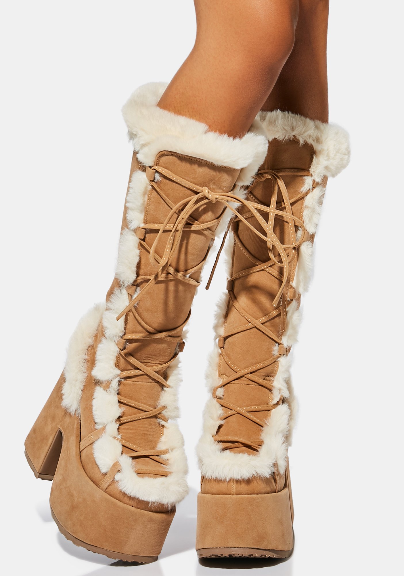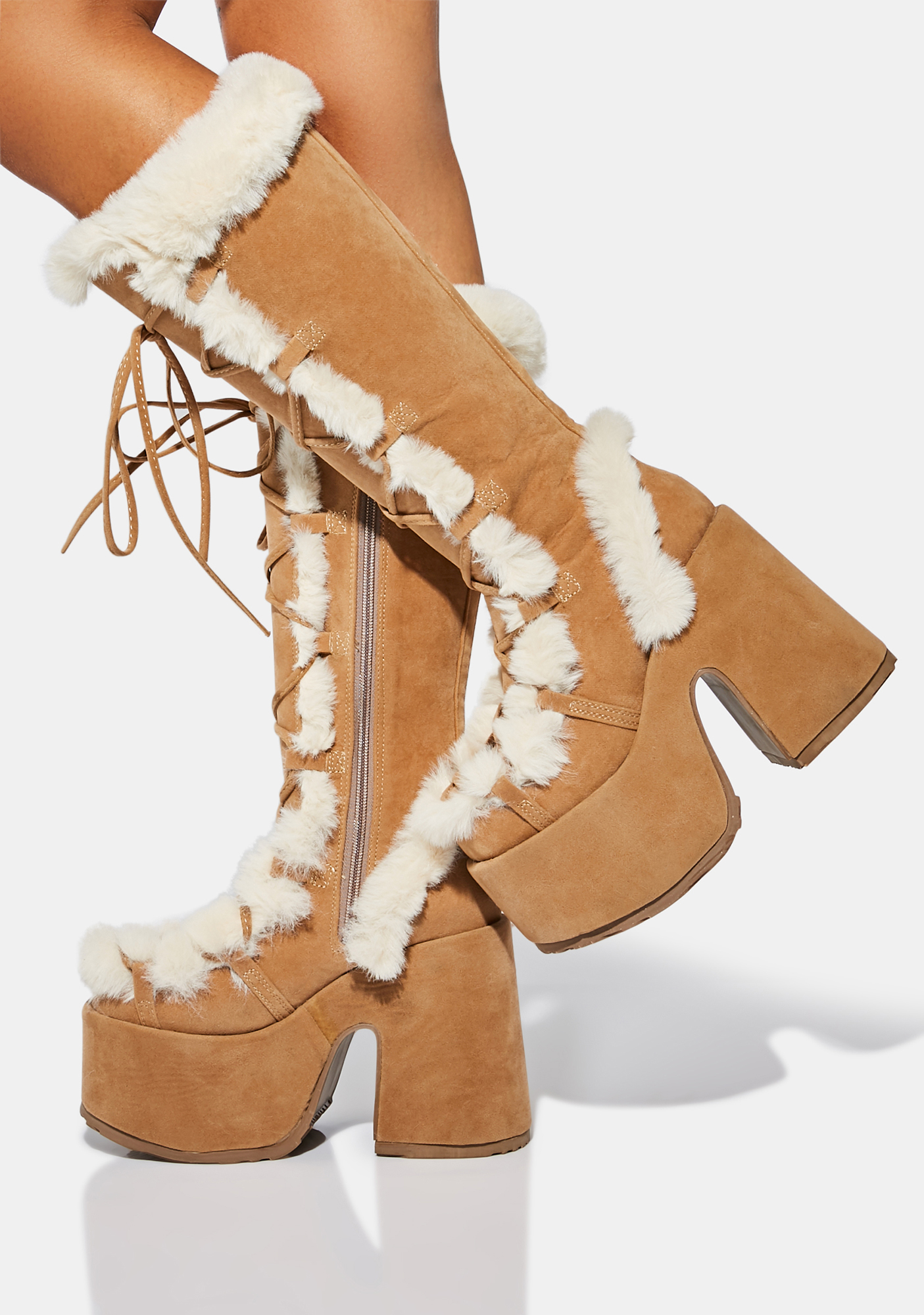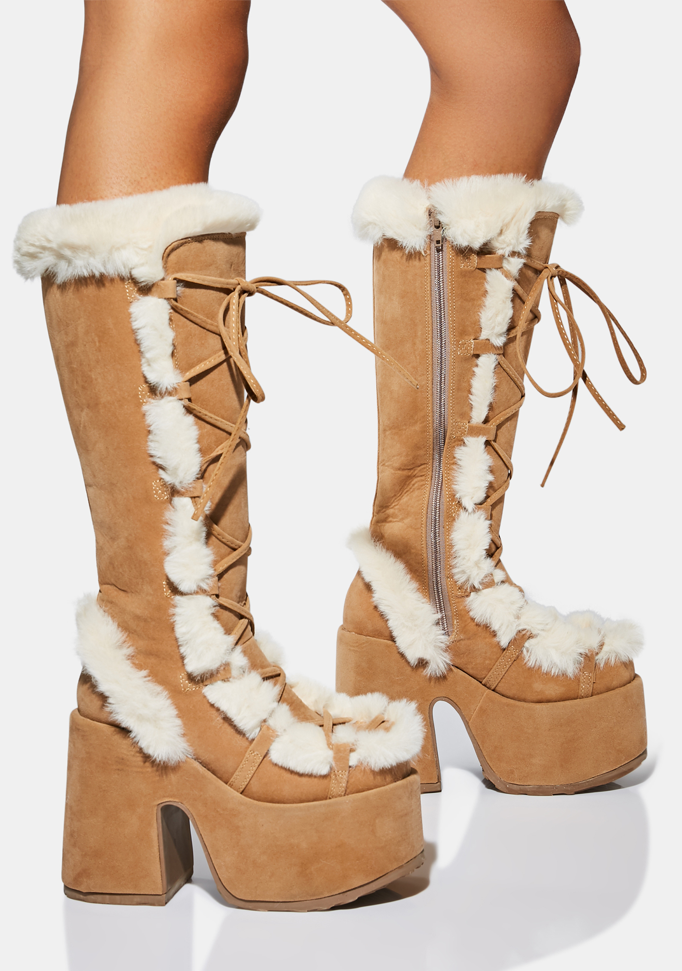 Brown Pure Vigilance Platform Boots cuz you’re a vision of wonderland, babe! Let ‘em know the arctic goddess has arrived in these knee high platform boots that have a vegan suede construction, fluffy faux fur trim, adjustable lace-ups on the front, and side zip closures.