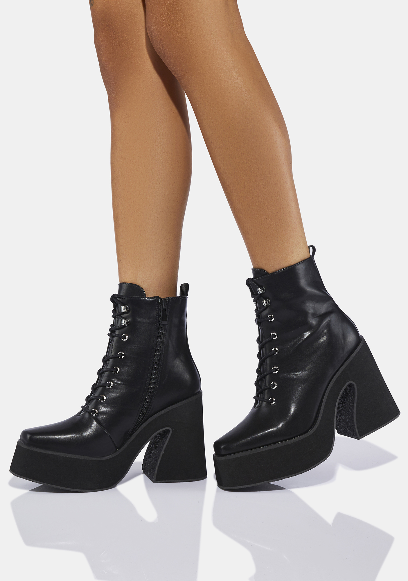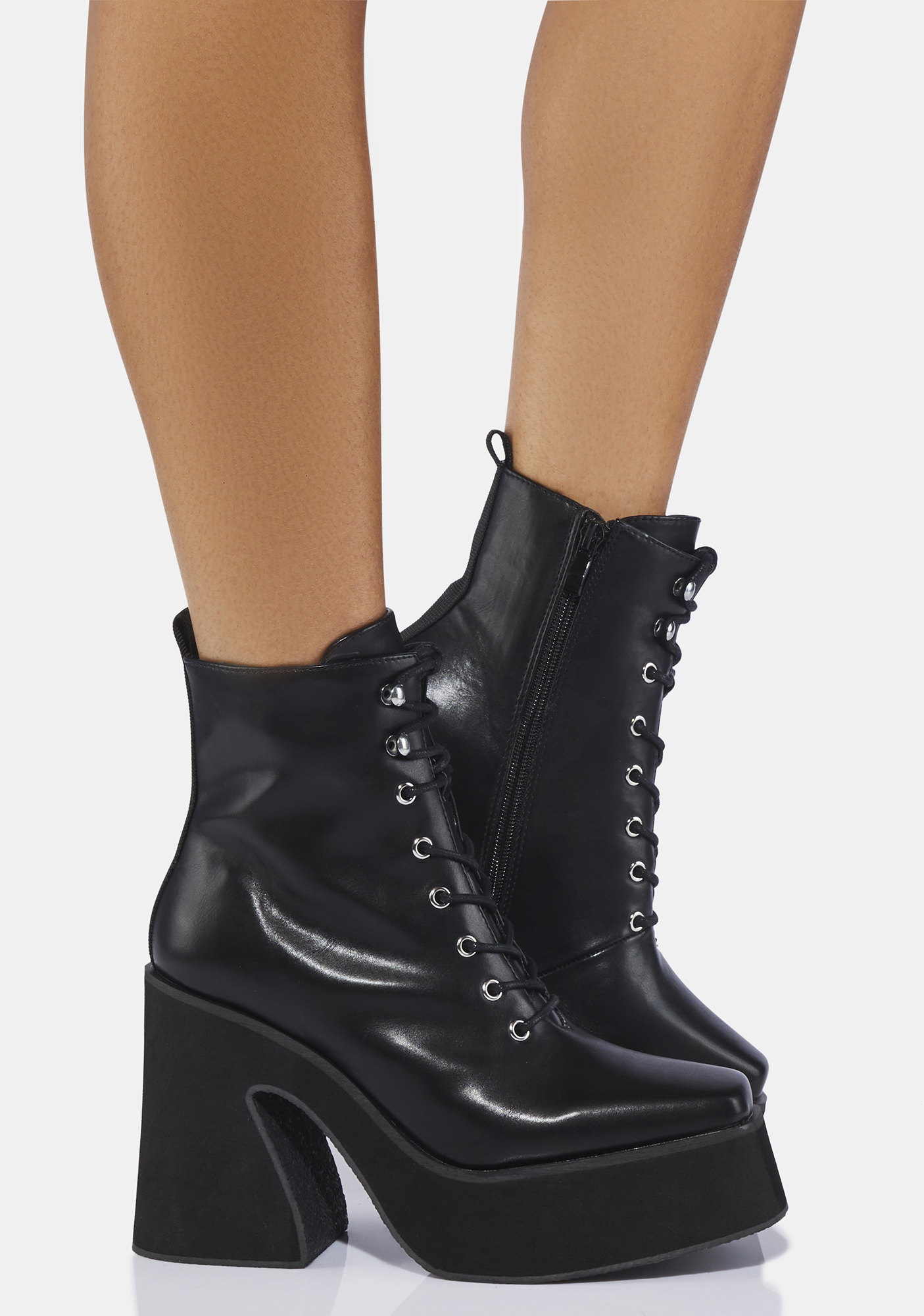 Enchantra Lace Up Platform Boots cast your magic spell! These ankle boots have a vegan leather construction, lace up fronts with silver grommet hardware, side zipper closures, square toes, and platform soles.