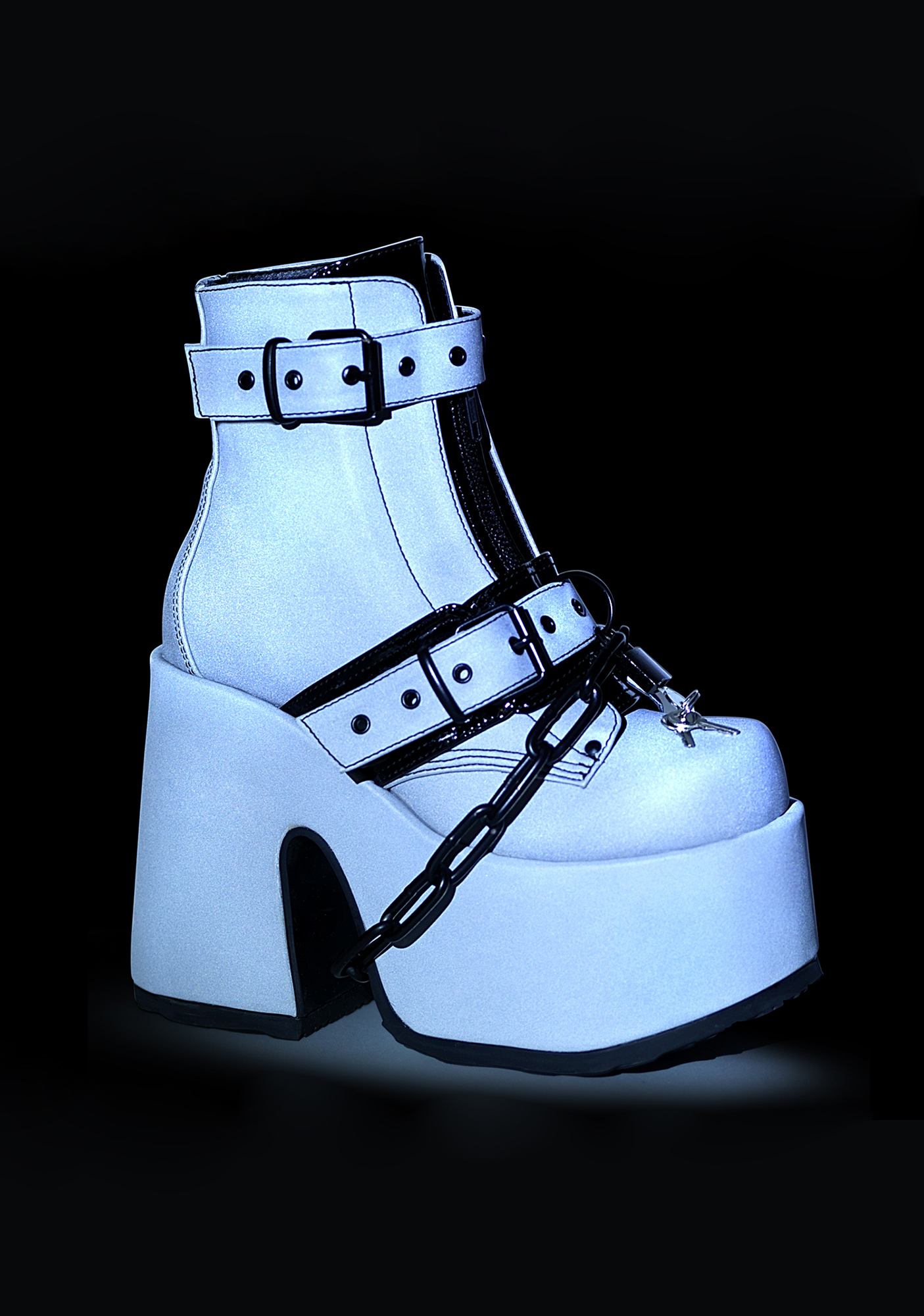 Glow In The Dark Ruin My Life Platform Ankle Boots burn it all to the ground! These platform ankle boots have a glow in the dark construction, eyelet buckle straps, chain detailing, chunky heels and front zip closures.